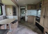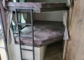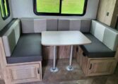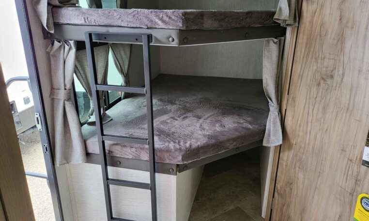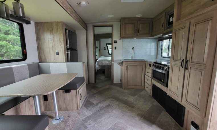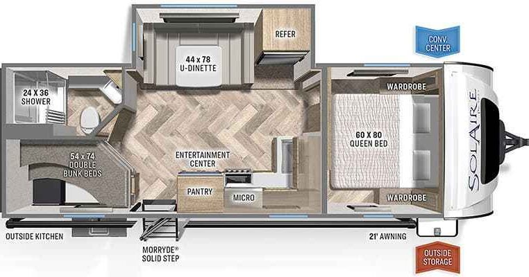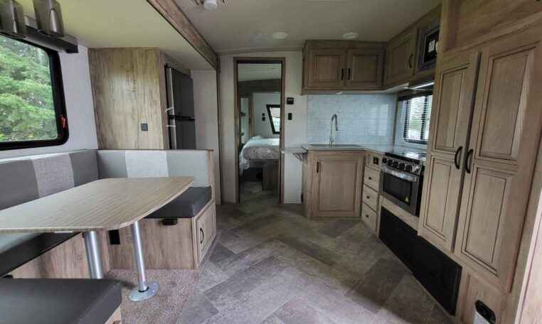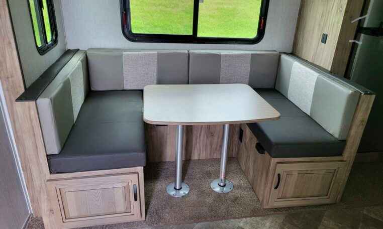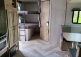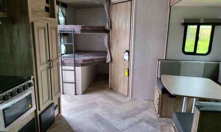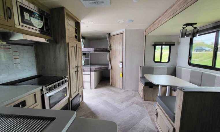 - Queen bed, double-size bunks, and U-shaped dinette for sleeping space.