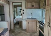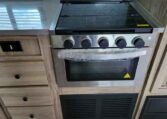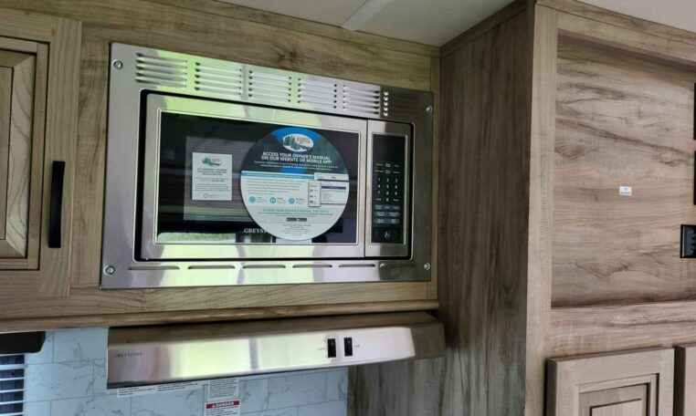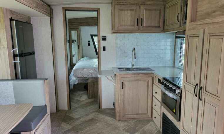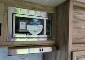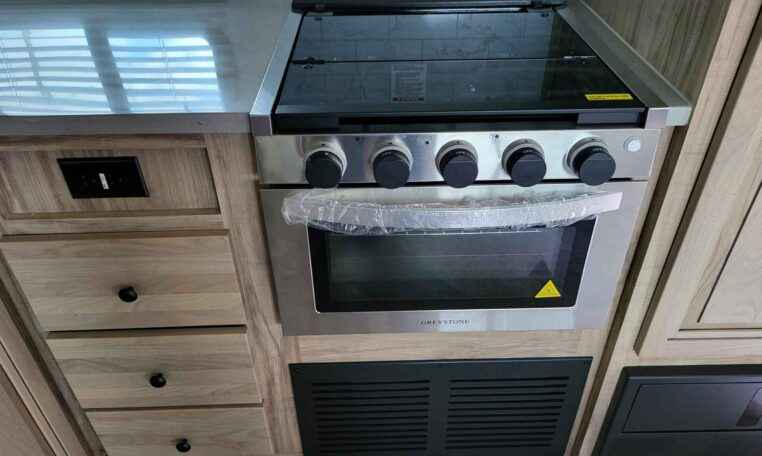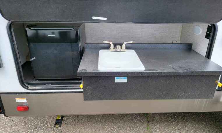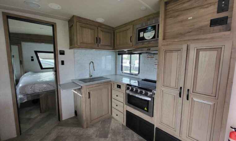 - Outside kitchen and full amenities inside, including a glass top flush mount range, microwave, and 11 cu. ft. refrigerator.