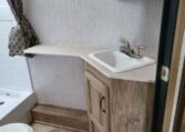 - Solid surface countertops, stainless steel kitchen sink, and ball bearing drawer guides.