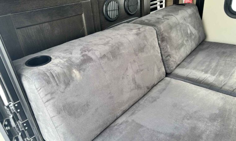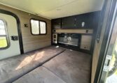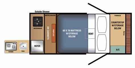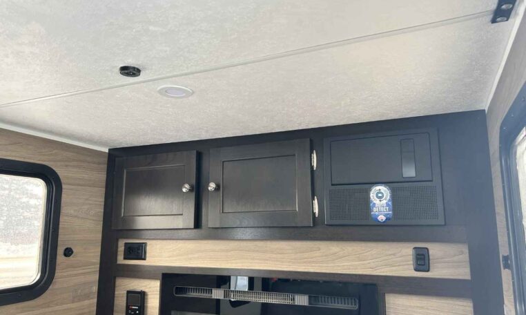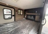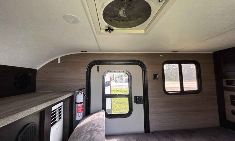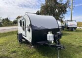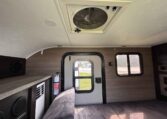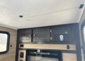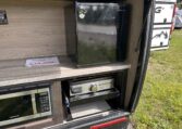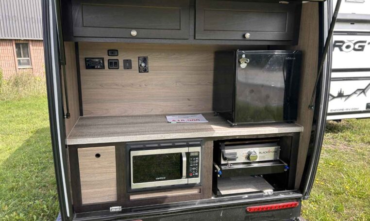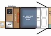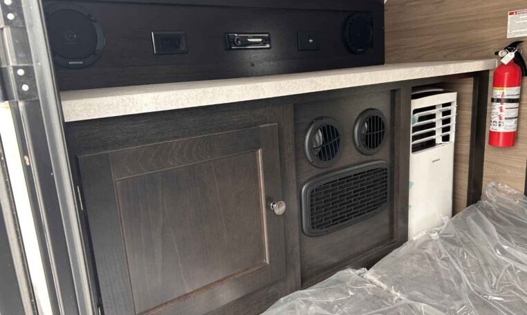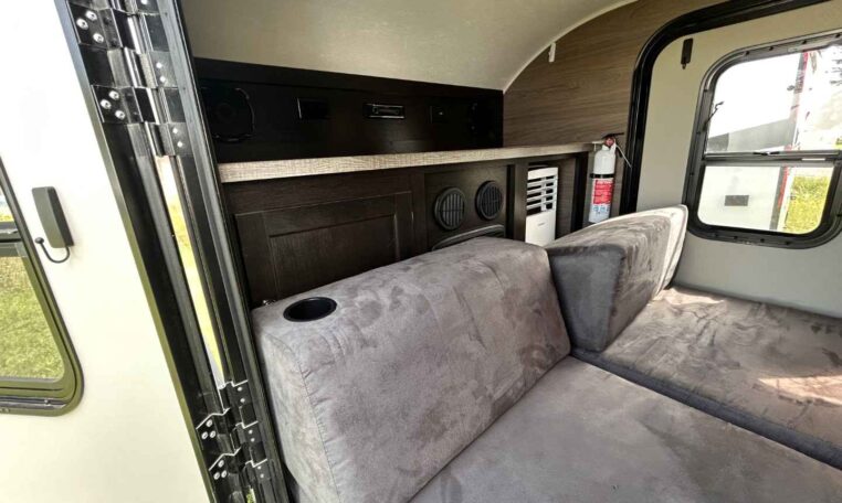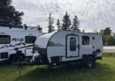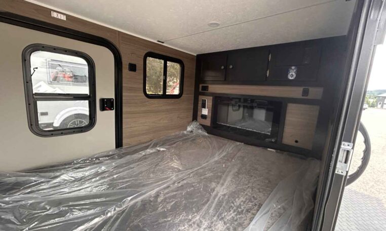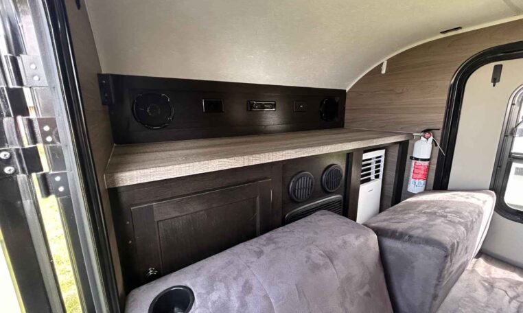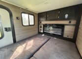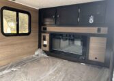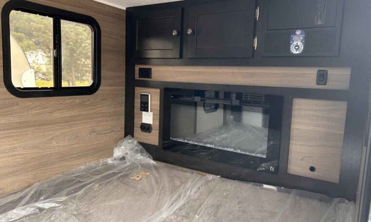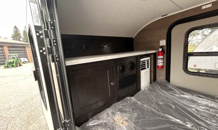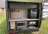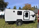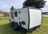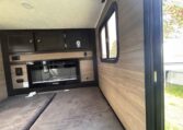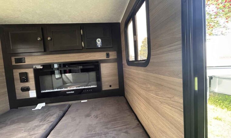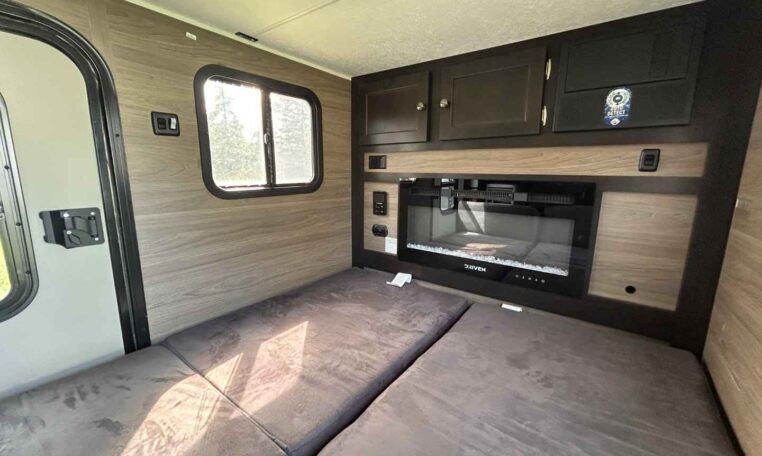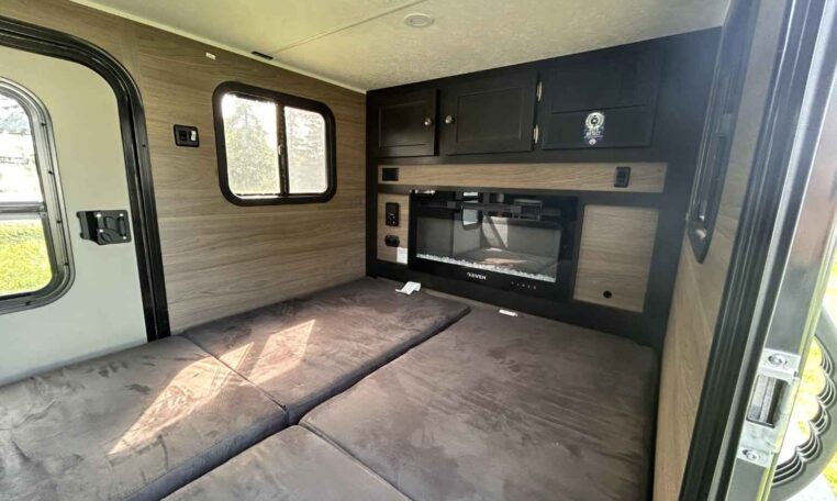 Pack your bags and head for the hills in this easy-to-tow trailer for two! The full outside kitchen includes everything you need to prepare meals each day, and there is an outside shower to fill the dogs water bowl or wash off your hiking boots. Head inside to rest on the 60″ x 78″ mattress, or maybe just relax by the fireplace and listen to your favorite tunes with the stereo included! This model also includes a countertop with storage below, an A/C and furnace to camp all year long, and a vent to keep fresh air moving inside.