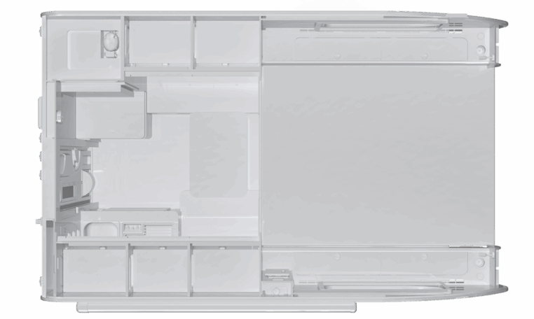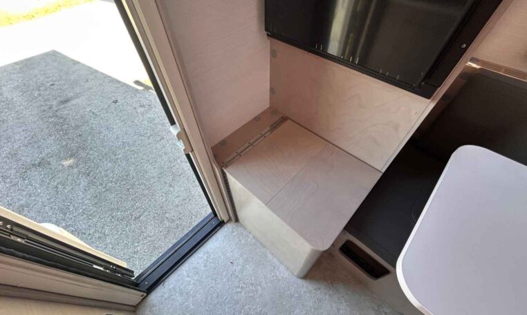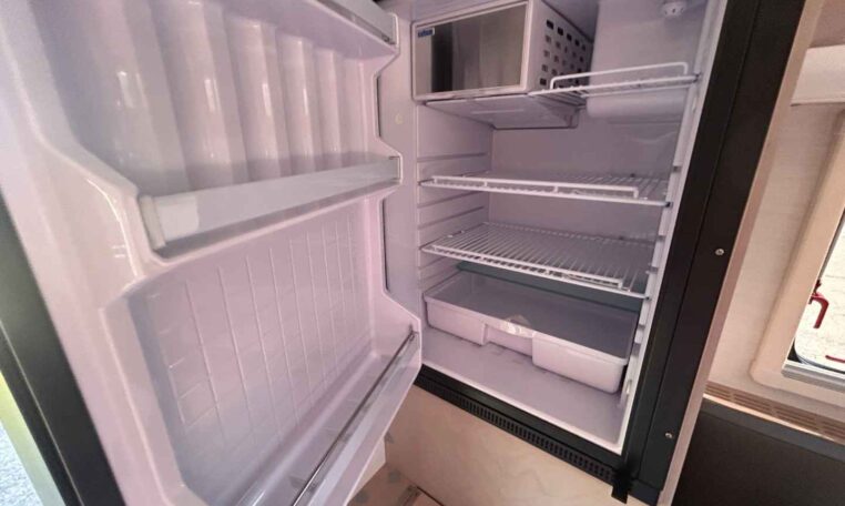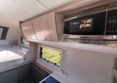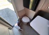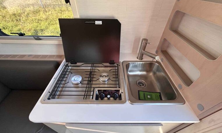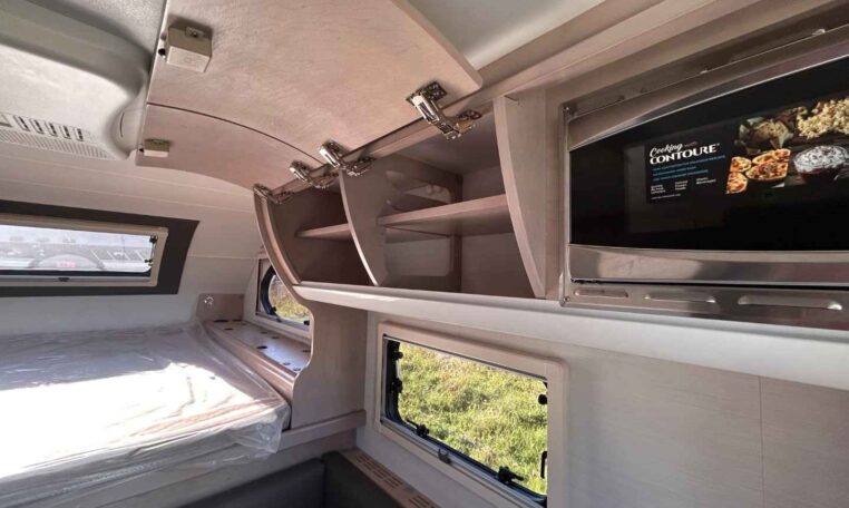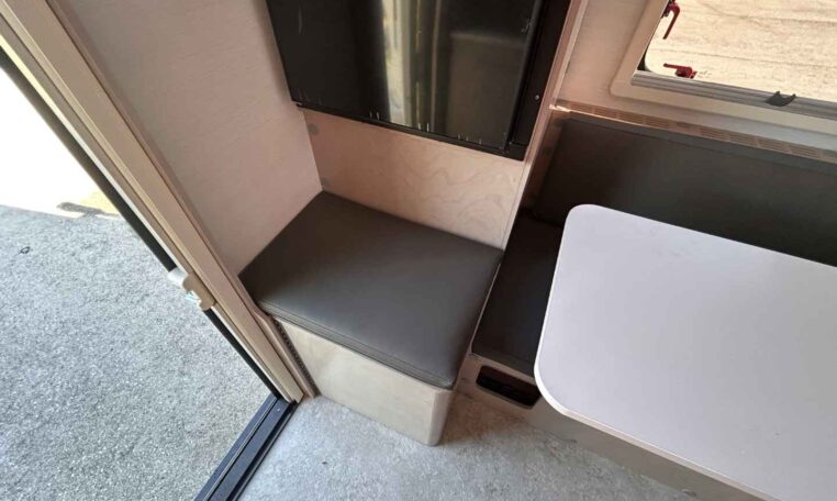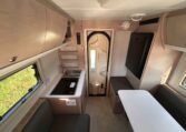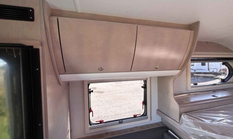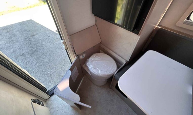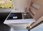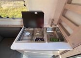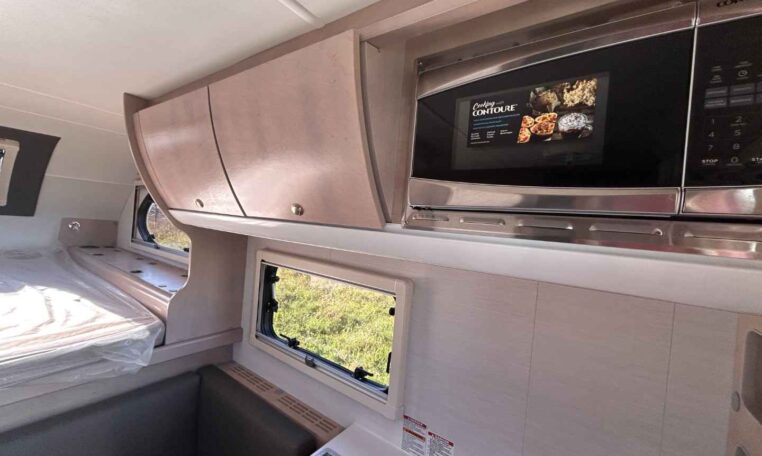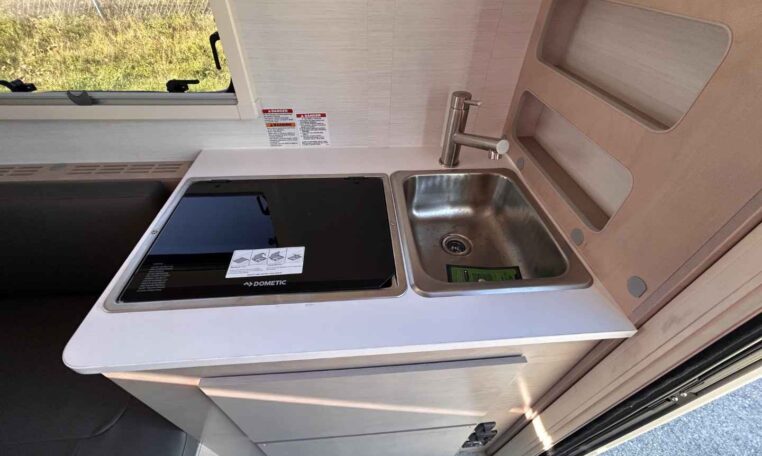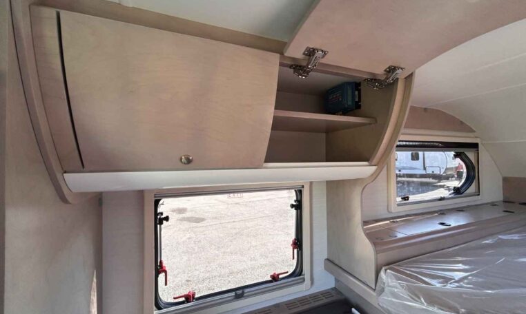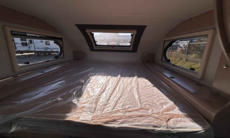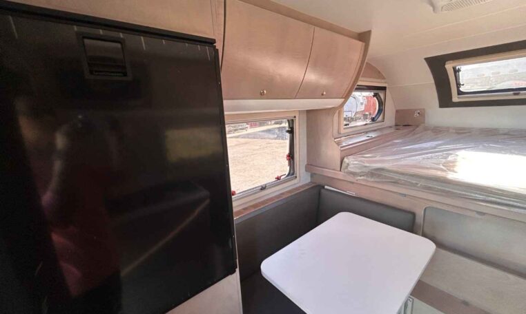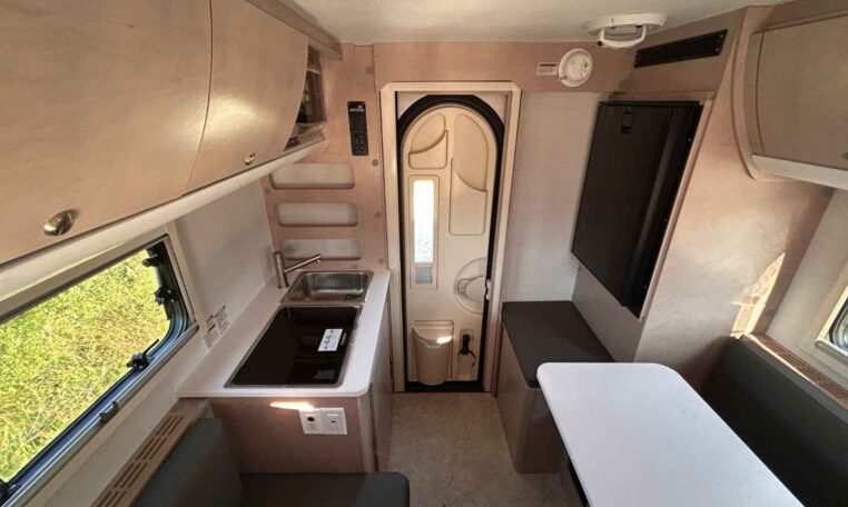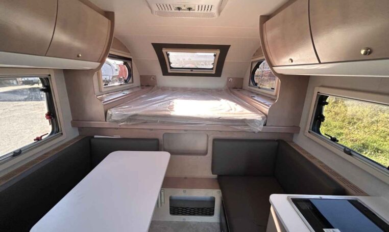 The Cirrus 620 prioritizes comfort and functionality. It features cozy sleeping accommodations. The camper’s well-designed kitchen boasts a two-burner propane stove, a stainless steel sink, and a spacious refrigerator, providing everything you need to prepare delicious meals on the road. It has a large freshwater tank, a convenient cassette toilet system, and a lithium battery. It also features an optional solar panel system for convenience and off-grid capability.