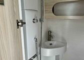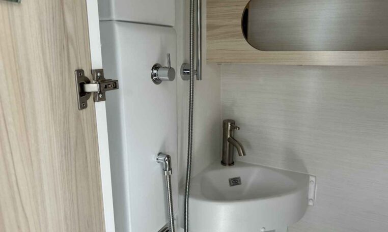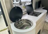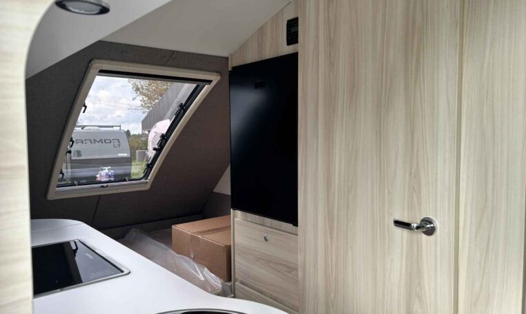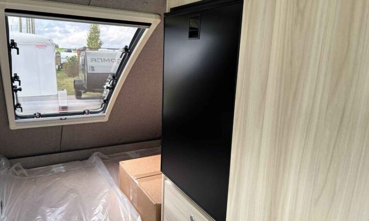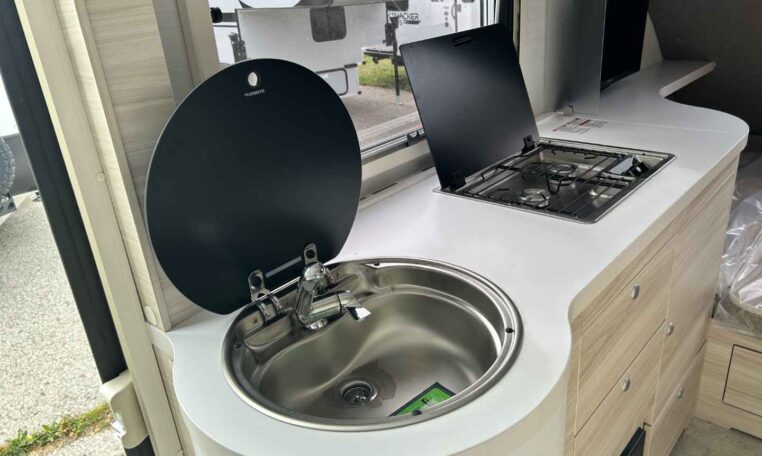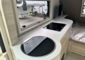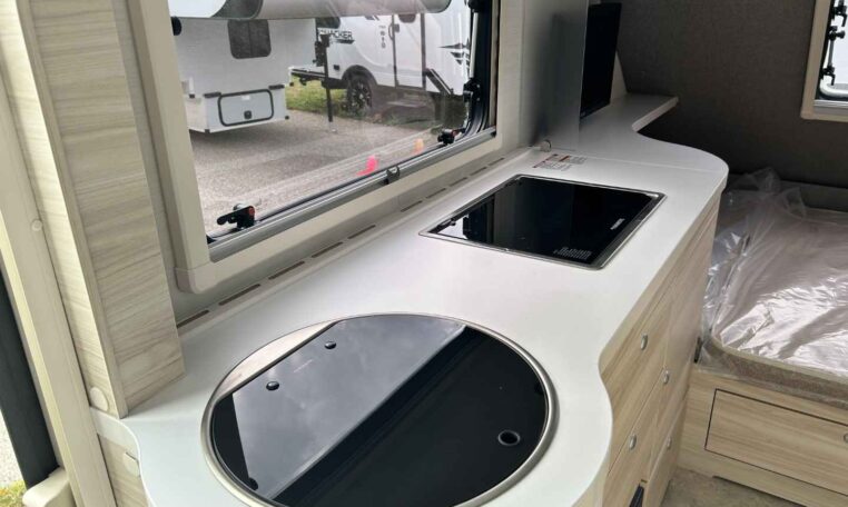 Camping in the TAB 400 feels more like glamping, thanks to the Alde® heating system, which keeps you warm and cozy on chilly nights while providing hot showers. The galley kitchen, equipped with a sink, a two-burner glass-top stove, and a roomy fridge, allows you to prepare meals without leaving the campground.