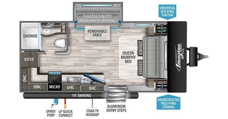 The Murphy bed is the eye-catching feature on this Imagine XLS travel trailer! Not only can it fold away in the morning to reveal a sofa for lounging, but it will also provide you with drawer storage under the sofa. Another functional feature is the theater dinette with a removable table in front. It rests on the single slide so that there is more floor space, and it offers you great comfort while you dine across from the LED HDTV. A full bathroom will keep you clean and fresh with its residential walk-in shower, skylight, linen closet, vanity, toilet, and power vent fan.