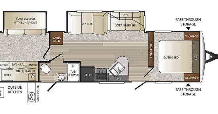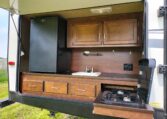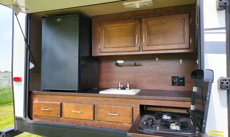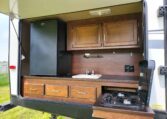 Just outside the bathroom exterior door find an outdoor camp kitchen featuring a refrigerator, flip-out stove with dual burners, and counter space with storage. Â You will also love the front pass-through storage for all of your camping gear, and so much more!