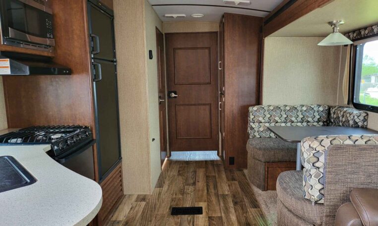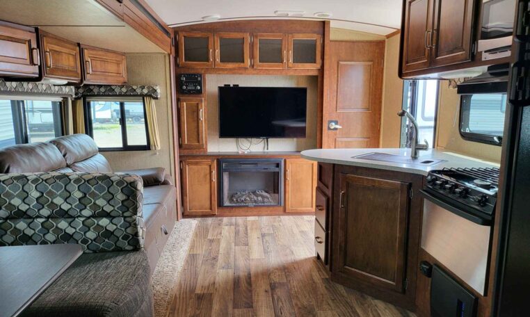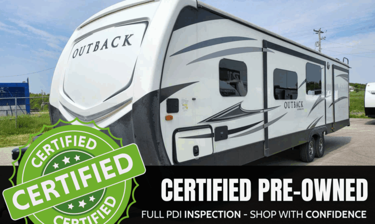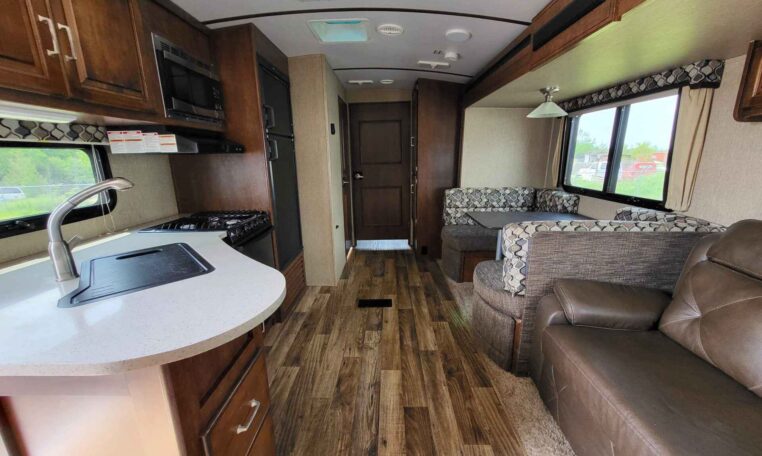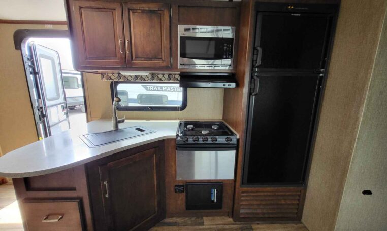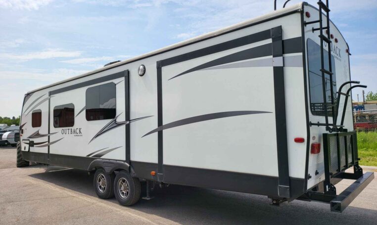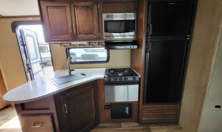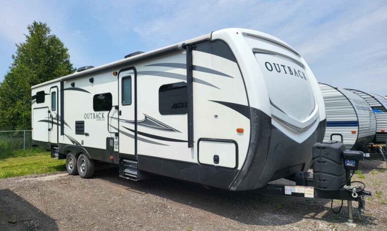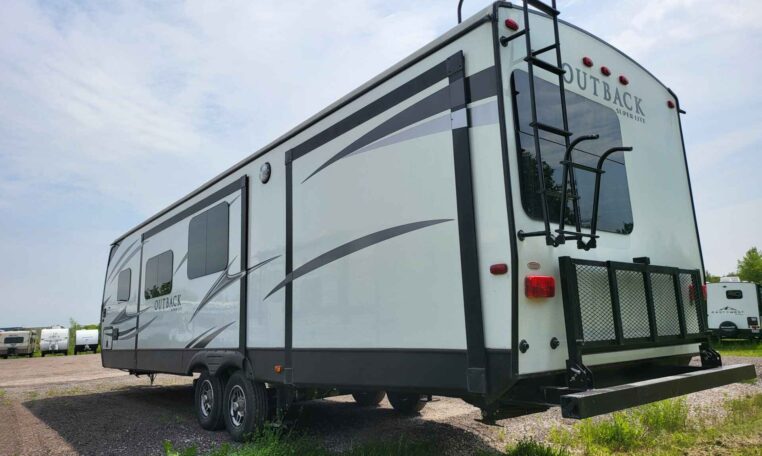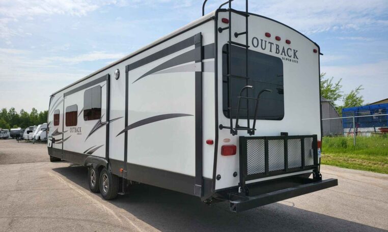 This Keystone Outback Super Lite 312BH is another great unit for the larger family to enjoy camping in. This travel trailer features a rear bunkhouse, dual entry doors, two slides for added interior space, an outdoor kitchen, and it sleeps 8-9 comfortably.