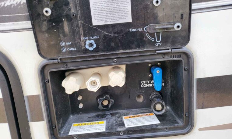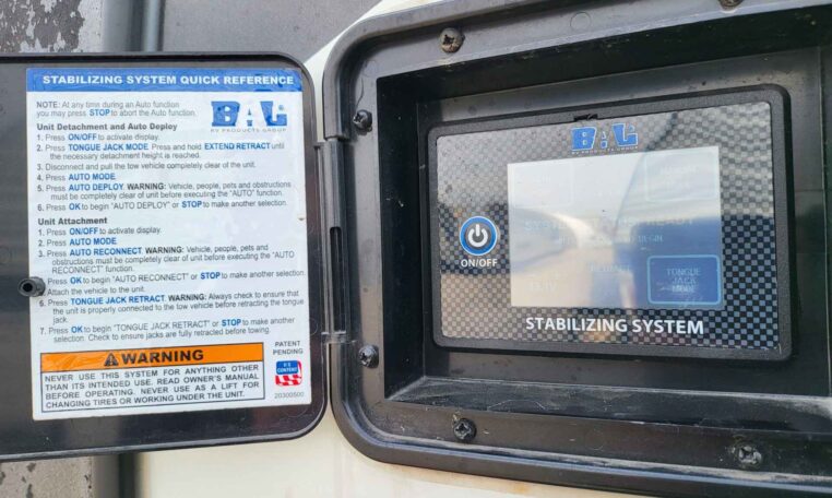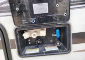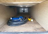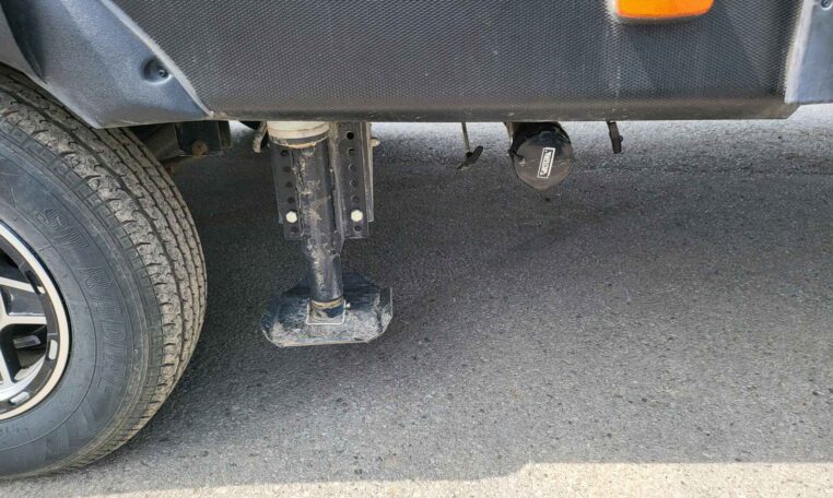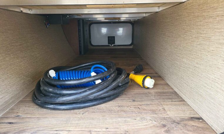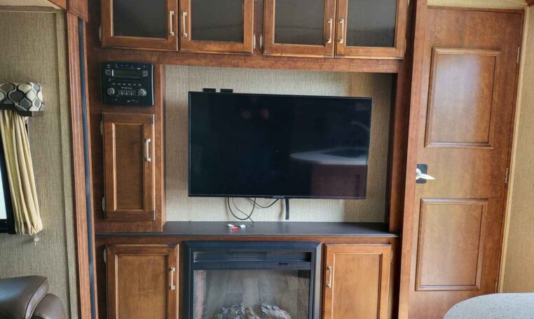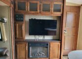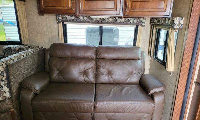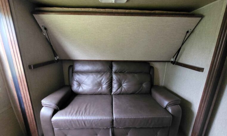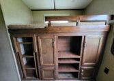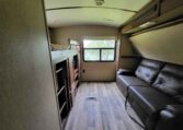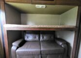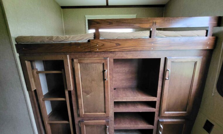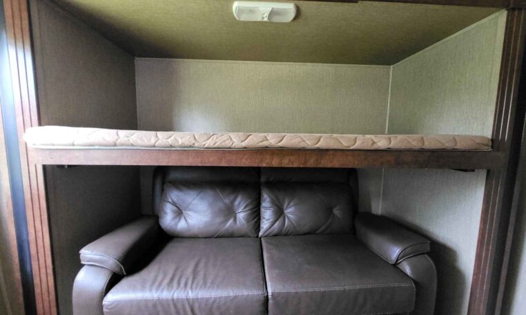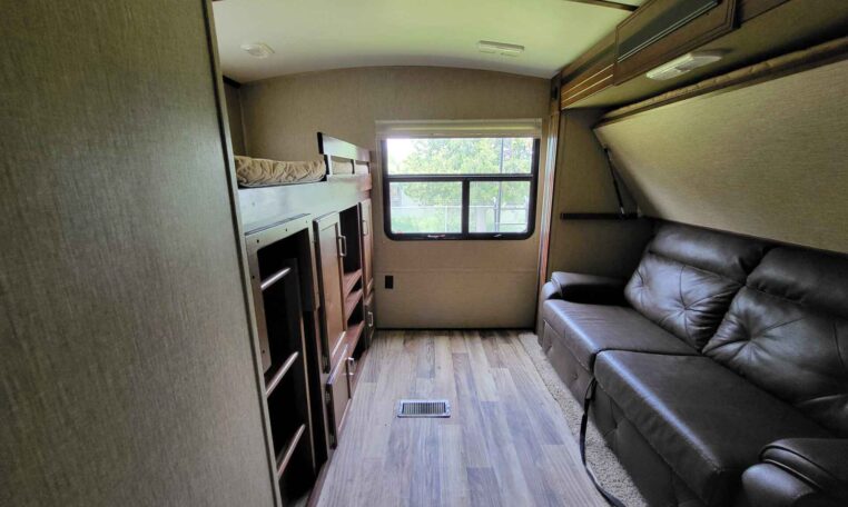 The rear bunkhouse is where you will likely find the kids hanging out. There is a sofa sleeper side on the right heading in with a bunk bed up above. On the left find a second bunk with storage cabinets and a TV shelf.
